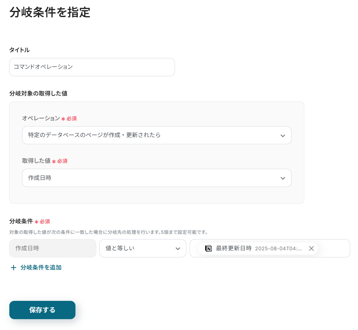 分岐の条件は追加することもできるので、さらに細かい条件にしたい場合は任意で設定してください。