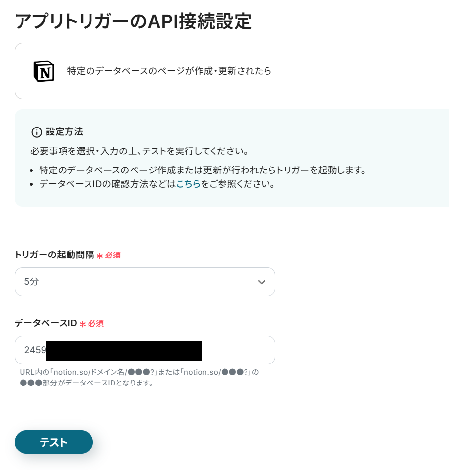 データベースIDは注釈に従って入力します。全て入力したら「テスト」をクリックしましょう。(Notionでデータベースを作成していない方は、テストの前に作成しておきましょう。)
