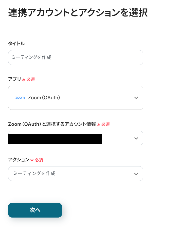 次に4つ目の工程をクリックします。こちらの設定で実際にZoom会議が自動で作成できます。