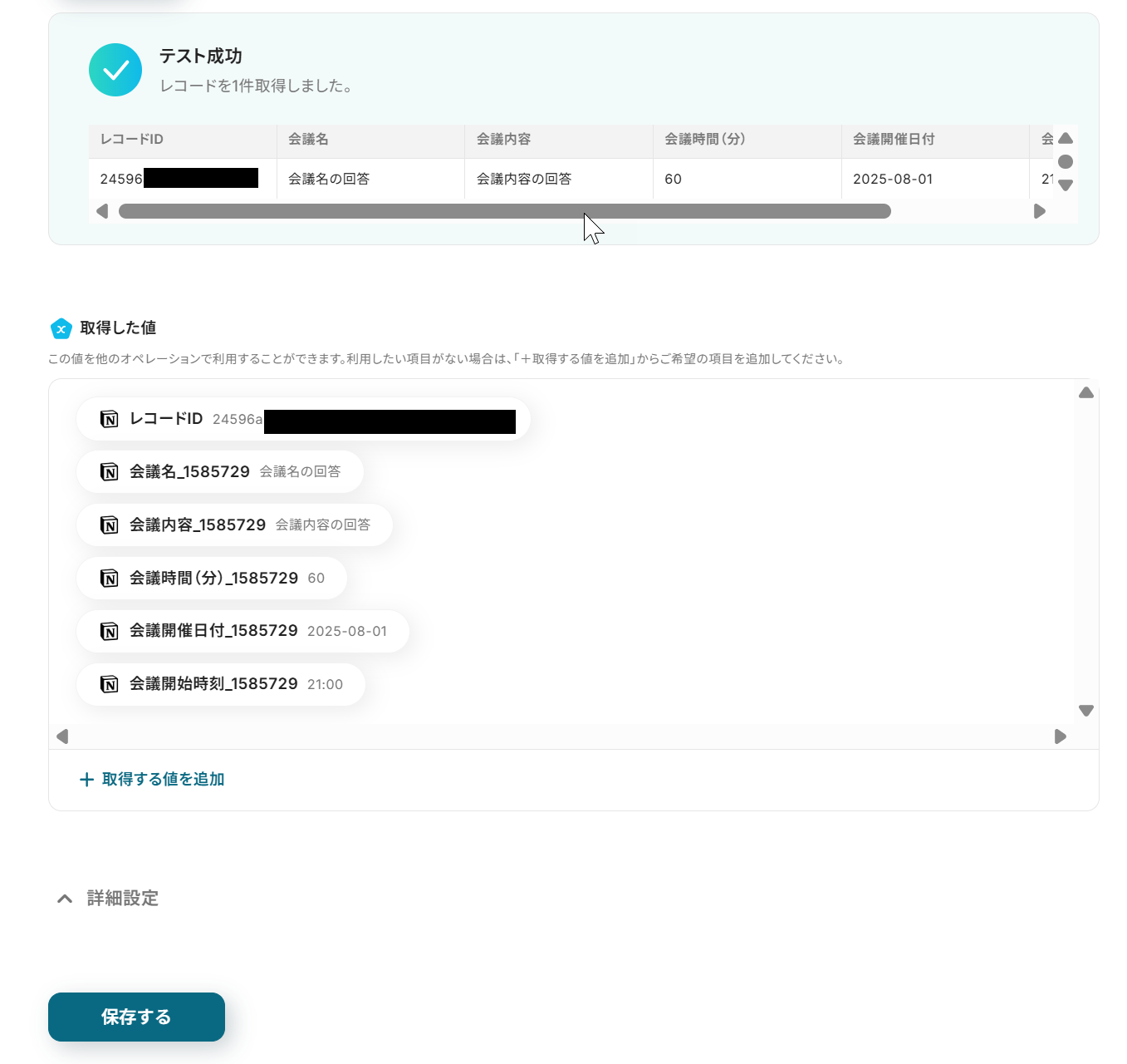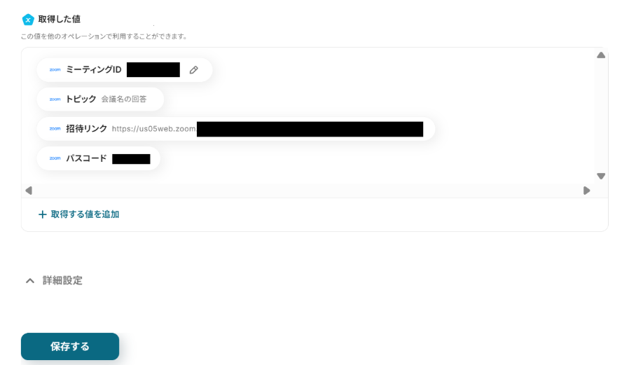 その際は、「取得する値」を追加する方法をご参照の上、値を追加して「保存する」をクリックしましょう。