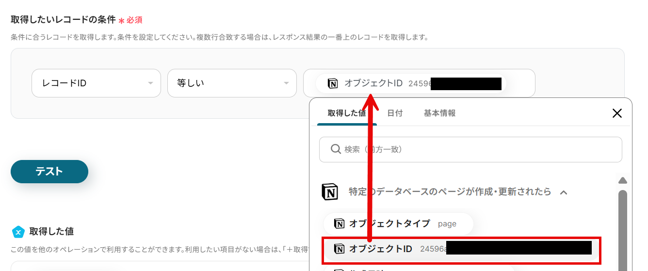 レコードIDと「等しい」「オブジェクトID」を選択しましょう。ここの条件は柔軟に設定できるので、必要に応じて条件を変更してみてください。
