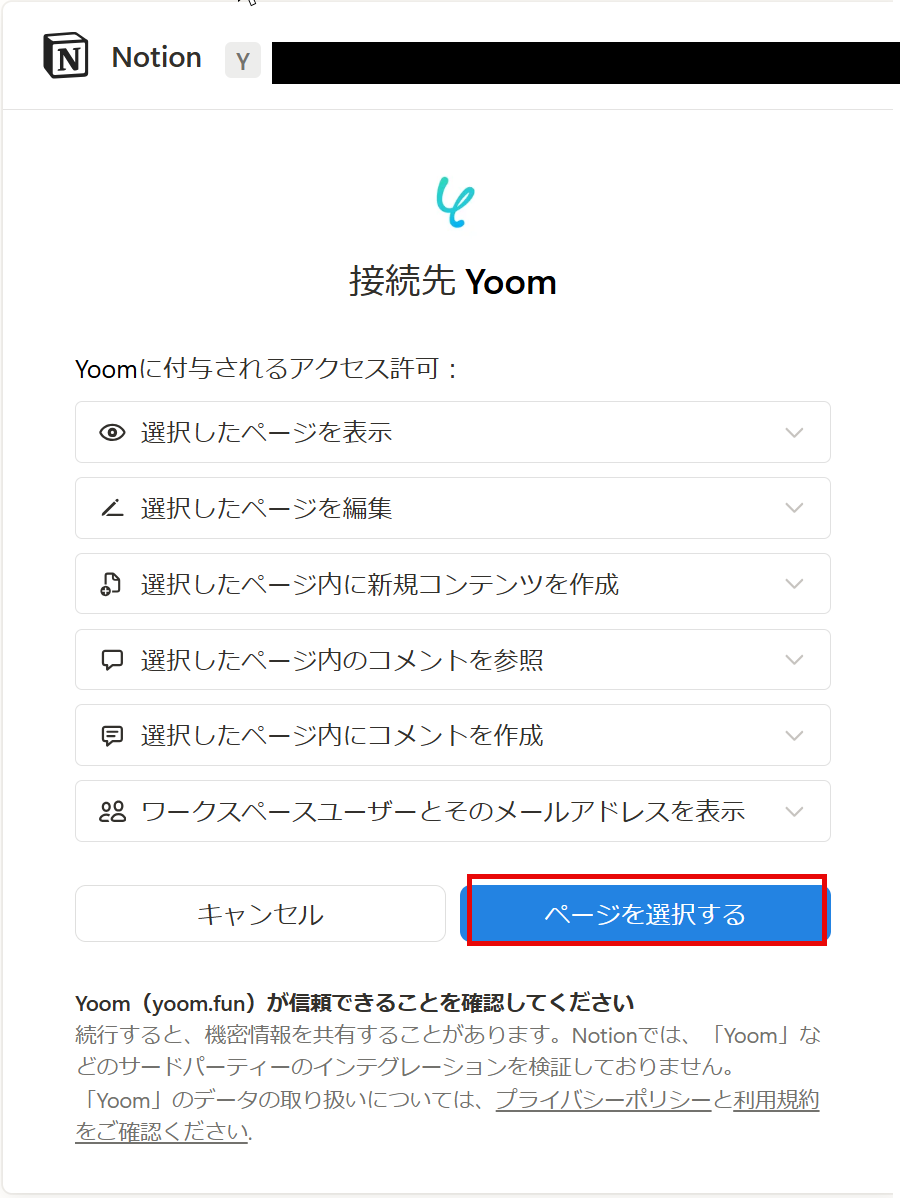 検索窓からNotionを検索し選択し、以下の画面で「ページを選択する」をクリックします。