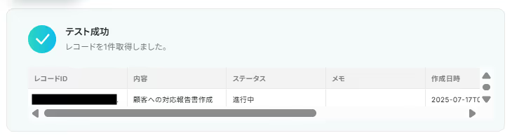 テストに成功し、レコード情報が1件取得されました。「保存する」をクリックします。