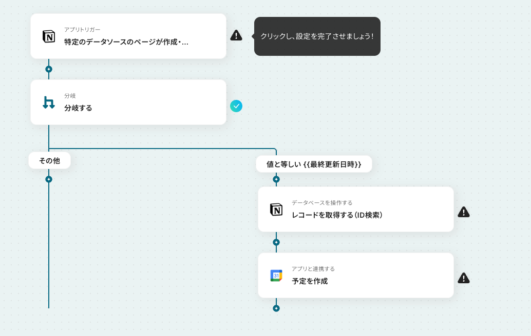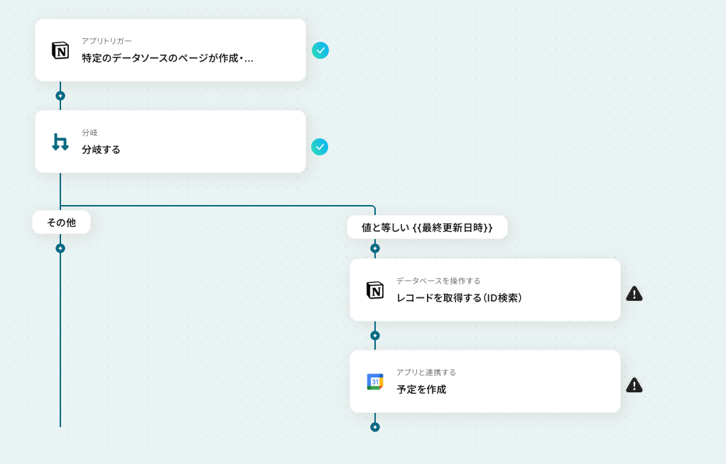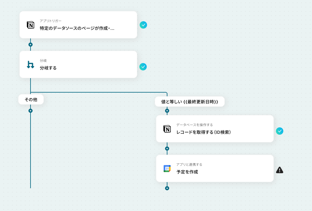 「レコードを取得する(ID検索)」のあとに、有料プランで利用可能な「分岐」オペレーションを追加することで、条件に合う場合のみGoogleカレンダーに連携できます。
