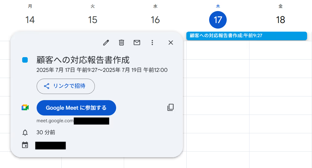 打ち合わせやイベントの予定をGoogleカレンダーに再入力する手間が省け、チームメンバーとのスムーズなスケジュール共有が可能になります。
