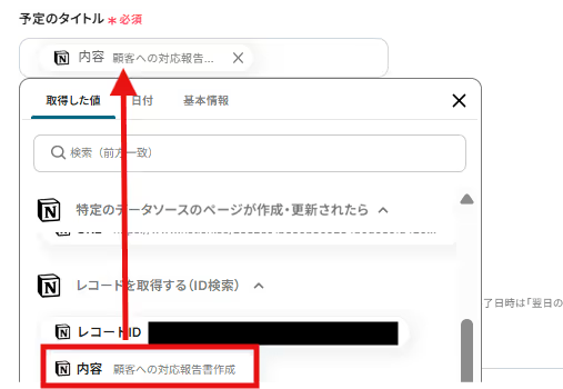 予定のタイトルを入力します。編集欄をクリックし、「レコードを取得する(ID検索)」から「内容」を選択してください。