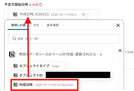次に予定の開始日時を入力します。編集欄をクリックし、「レコードを取得する(ID検索)」から「作成日時」を選択してください。