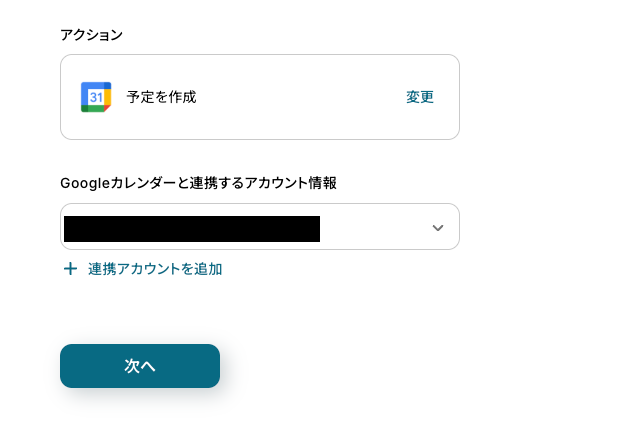 Googleカレンダーと連携するアカウント情報を確認し、トリガーアクションは「予定を作成」のままで「次へ」をクリックします。