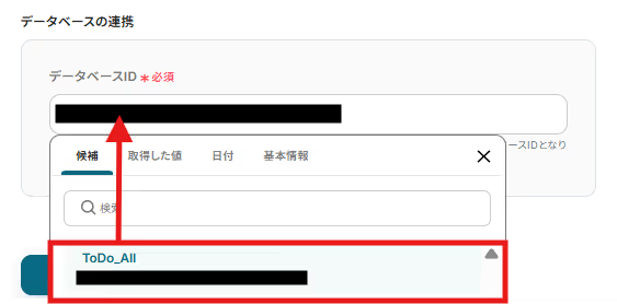 編集欄をクリックするとNotionのページ候補が表示されるので、前工程で指定したデータベースと同じページを選択してください。