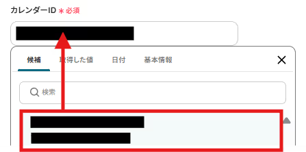 編集欄をクリックし、候補からNotionのタスク期限を反映させたいカレンダーを選択してください。選択すると、IDが自動で入力されます。