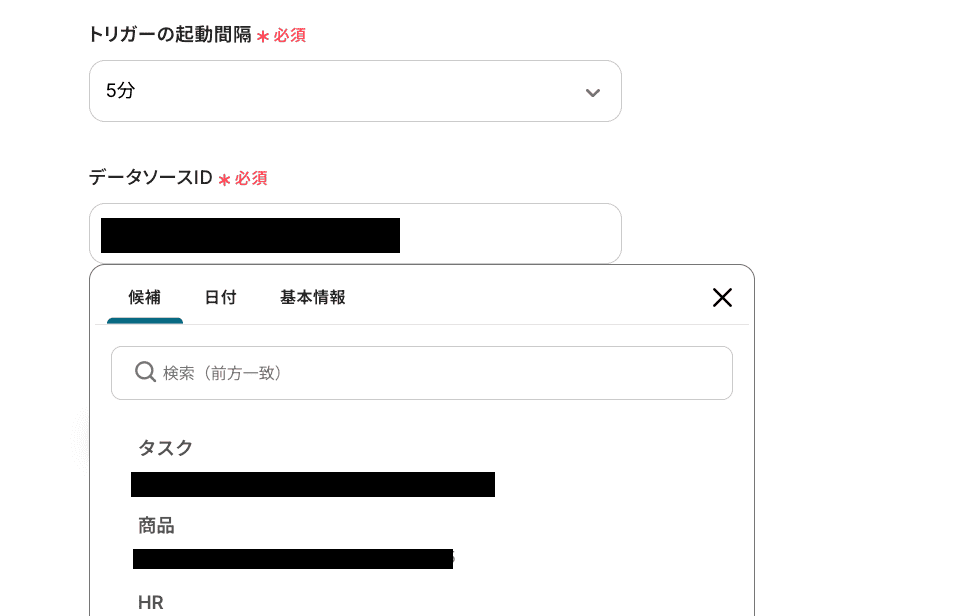 編集欄をクリックし、「特定のデータソースのページが作成・更新されたら」から「ID」を選択し、その後「テスト」をクリックしてください。