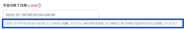 青枠の説明を参考に、予定の終了日時を入力します。