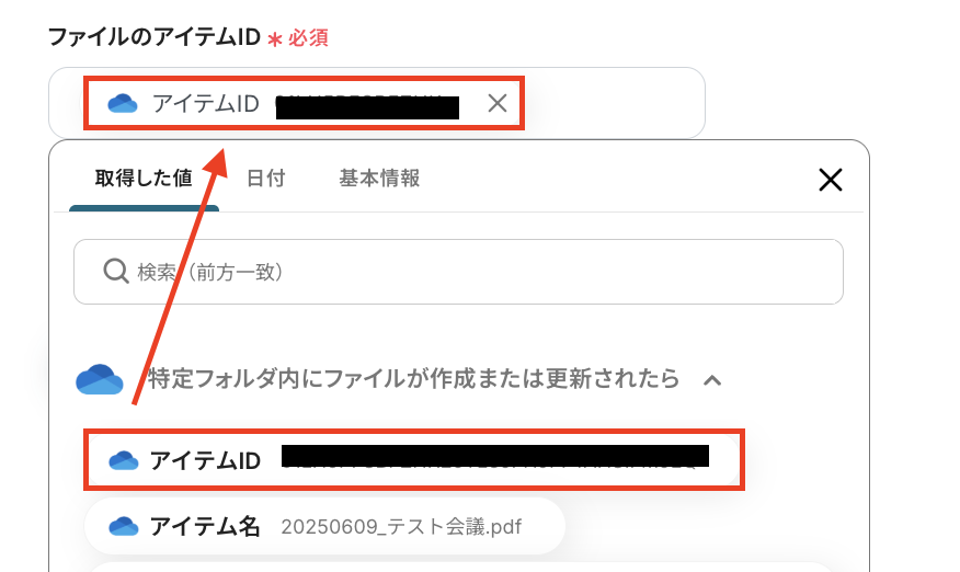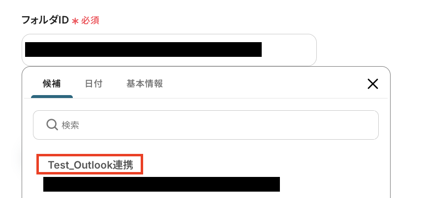 「ドライブID」は、入力欄をクリックして表示される候補から選択します。候補は、連携しているアカウントに紐づいて表示されますよ!