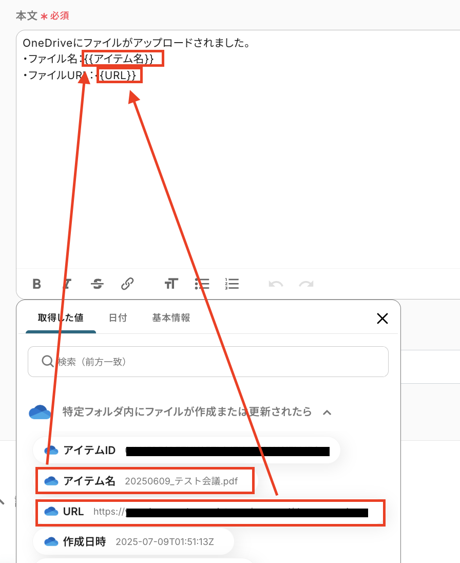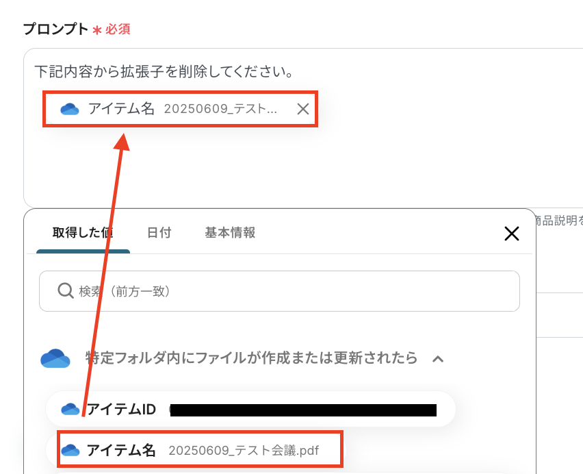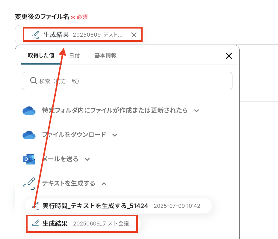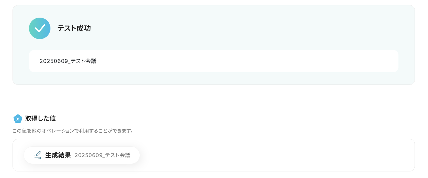 アウトプットとは、トリガーやオペレーション設定時に、「テスト」を実行して取得した値のことを指します。