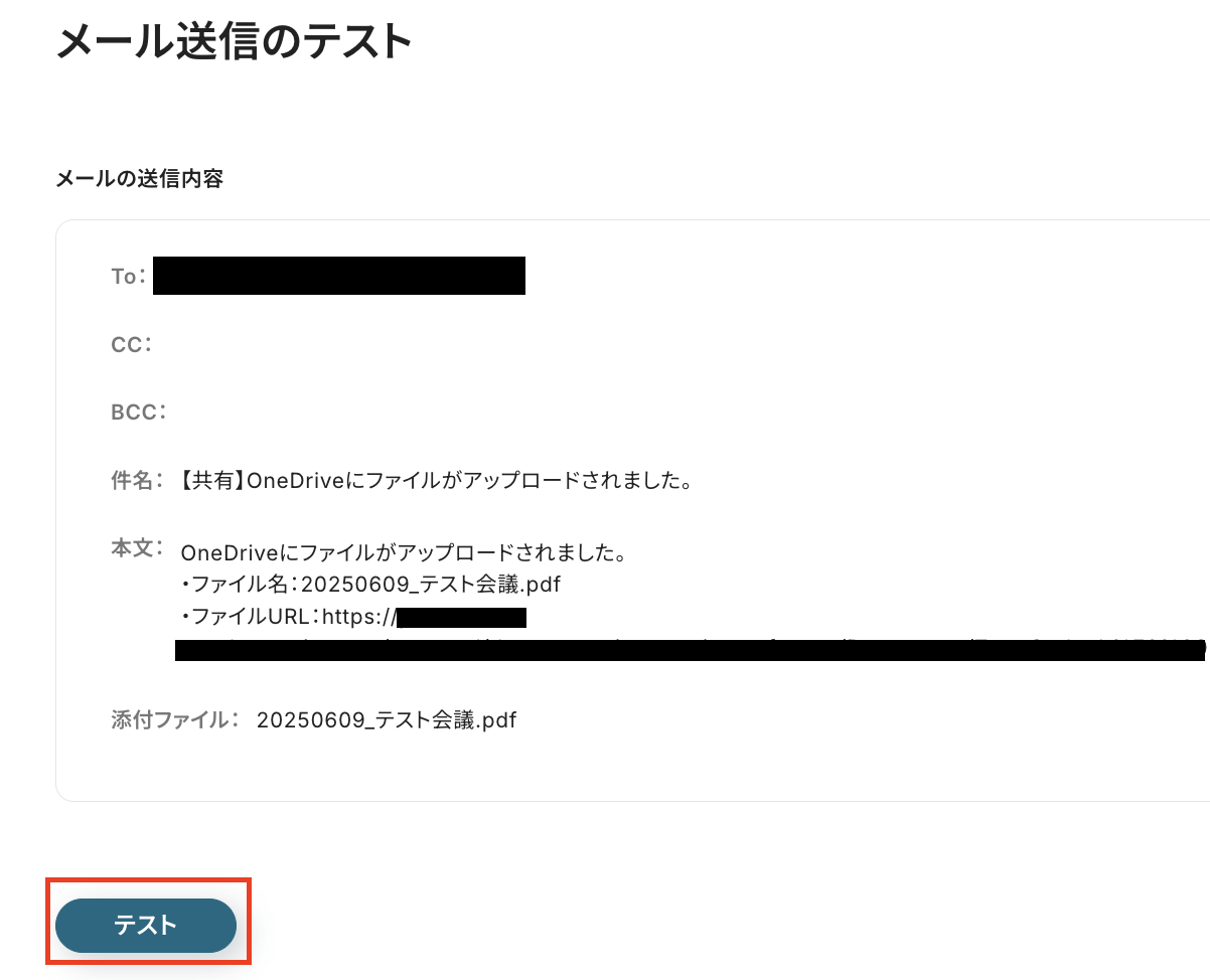 アップロードしたら、Yoomの画面に戻って「テスト」をクリックします。