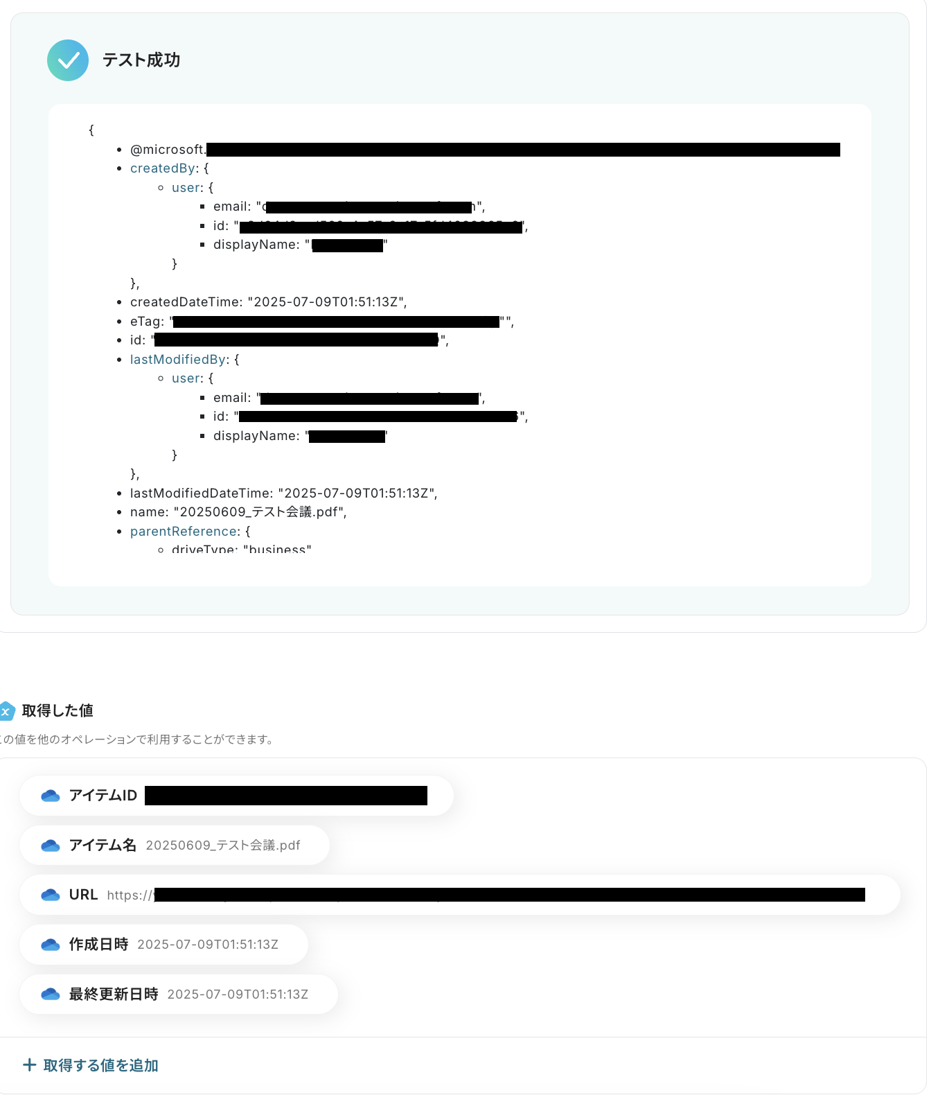 テストが成功すると、先ほどアップロードしたテスト用のファイル情報が、「取得した値」にアウトプットとして抽出されるので、内容を確認しましょう。
