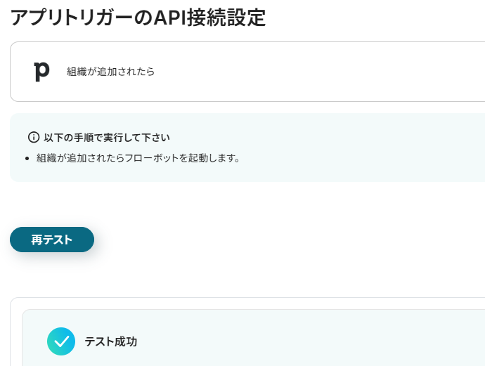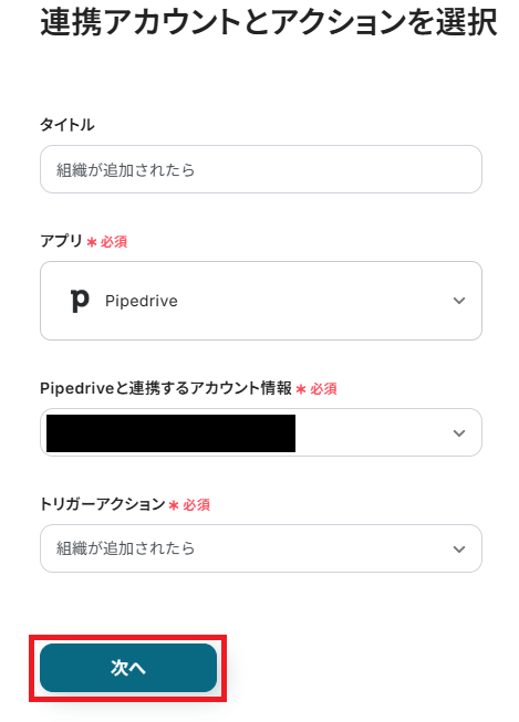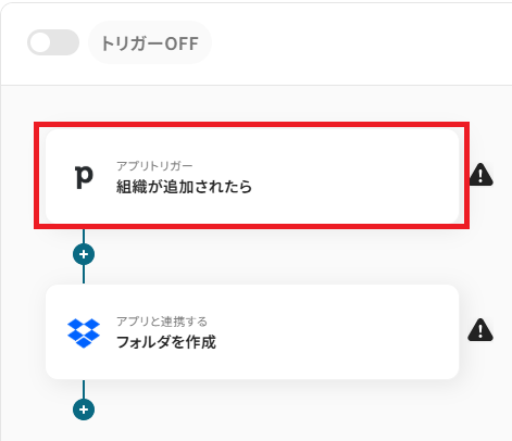 まずはこのフローボットでトリガーになっている、Pipedriveの「組織が追加されたら」というアクションを設定していきましょう。