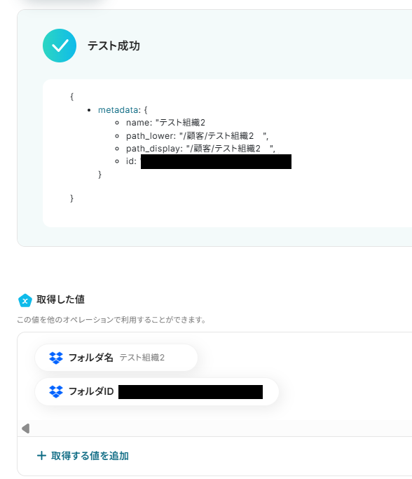 テストを押し、取得した値にアウトプットが入れば完了です。