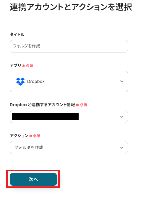 次にDropboxにフォルダを作成していきます。Yoomフロー上の「フォルダを作成」をクリックしてください。
