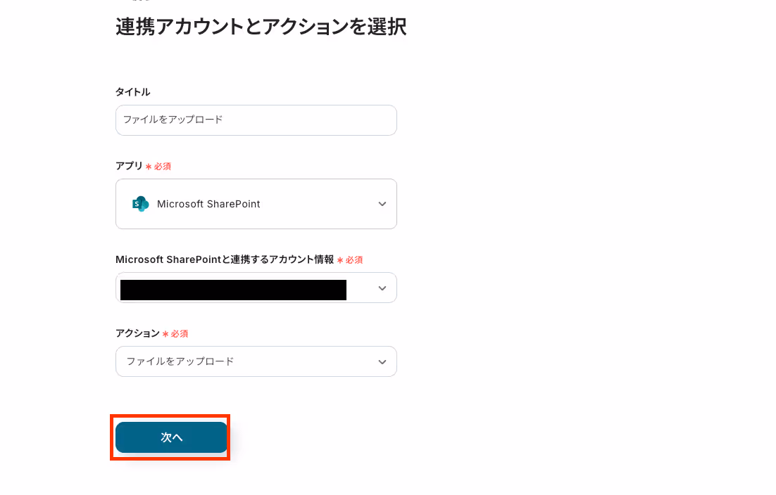 連携するアカウント情報が入力されているかを確認して、[次へ]を押します。