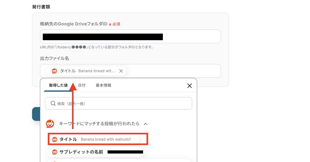 「ファイル名」は、前ステップから取得した値【発行した書類】を引用しました。