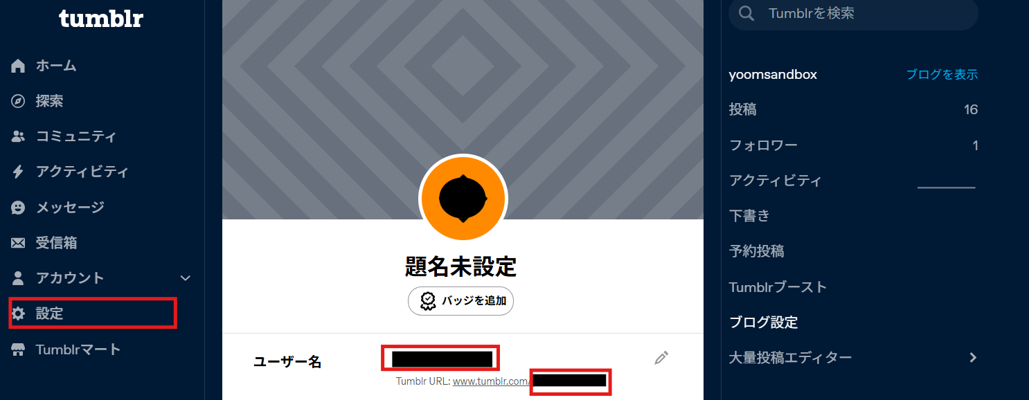 「ユーザー名 」 または 「ブログURL」の赤枠内に表示されている箇所がBlog Identifierです。