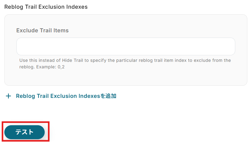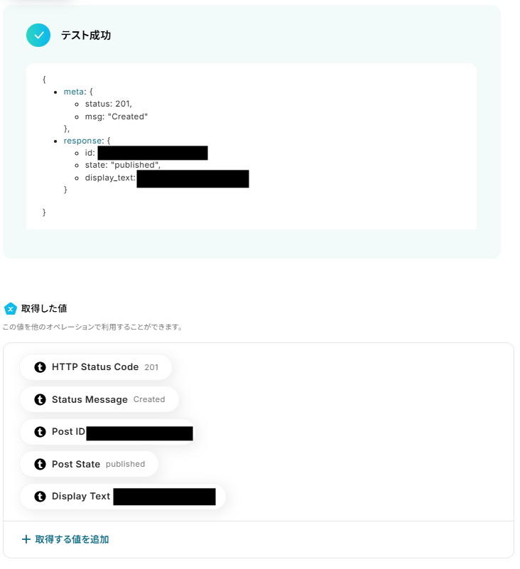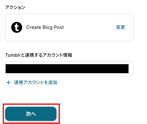 Inoreaderと同様に、ステップ1でマイアプリ連携したTumblrのアカウント情報が自動で表示されます。