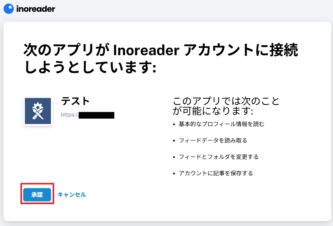 アプリ一覧で、Inoreaderを検索し選択すると、以下の画面が表示されます。