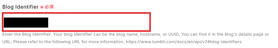 Tumblrで確認したBlog Identifierをコピーして、貼り付けます。