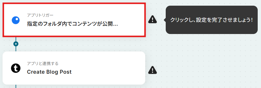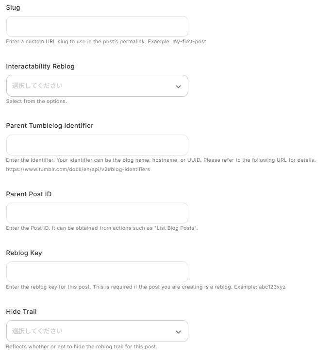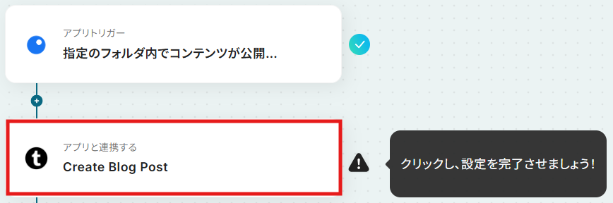 - 最後に、オペレーションでTumblrを選択し、「Create Blog Post」アクションを設定します。これにより、トリガーで取得した情報を基にブログ投稿が自動で作成されます