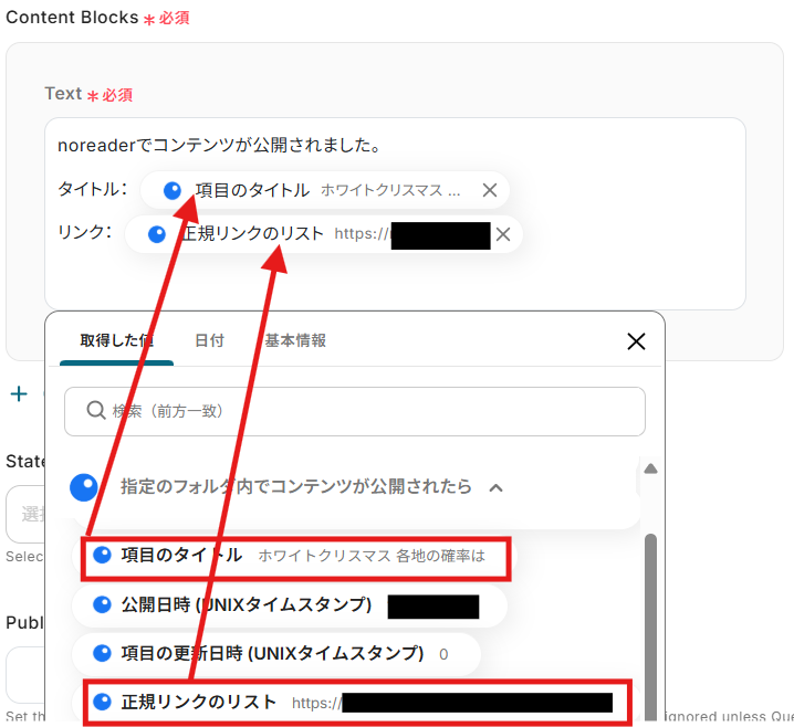 テキストを直接入力した部分は固定値として処理されるため、毎回変動が必要な情報({{項目のタイトル}}や{{正規リンクのリスト}}など)には取得した値を活用することが重要です!