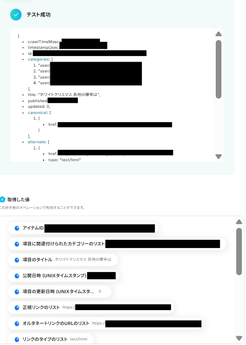 テストが成功すると取得した値の横に、連携したInoreaderのフォルダから取得した記事の詳細情報が表示されます。「完了」をクリックして設定完了です!