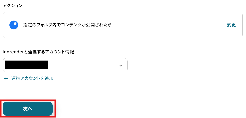 - 次に、トリガーでInoreaderを選択し、「指定のフォルダ内でコンテンツが公開されたら」というアクションを設定します