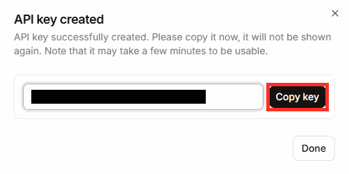 ※API Keyは作成時にしか確認できないため、コピーして安全な場所に保管してから画面を閉じてください。