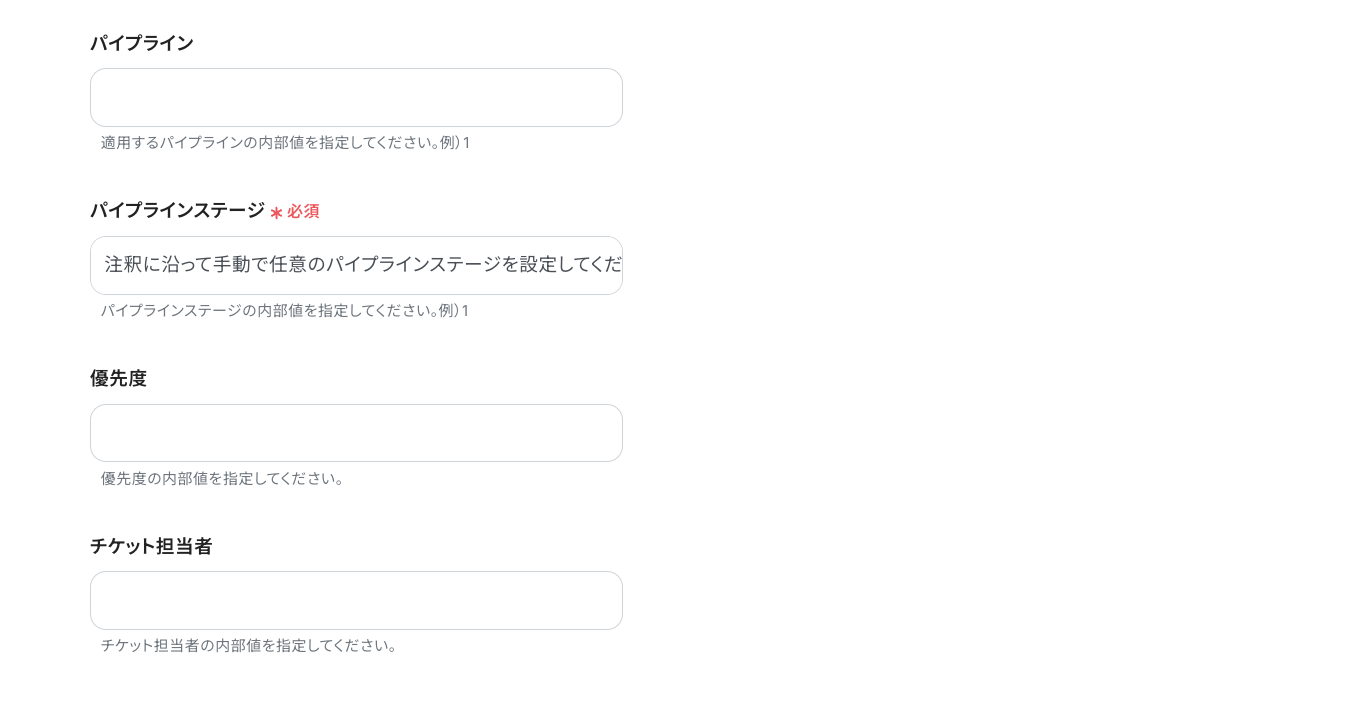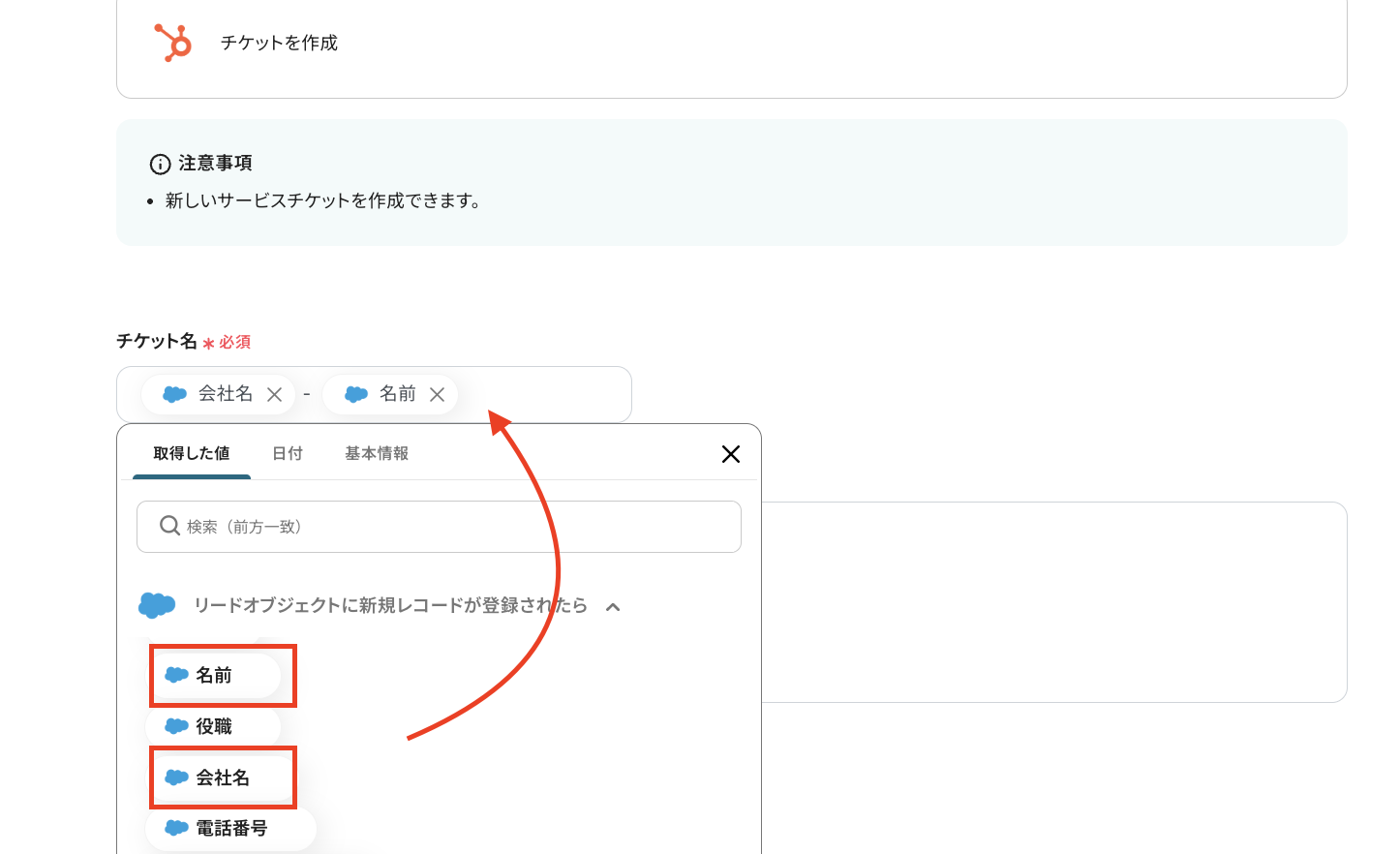 今回は【会社名】と【名前】をチケット名に設定するようにしました。