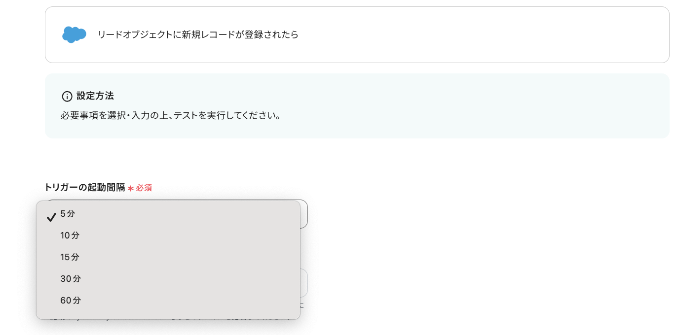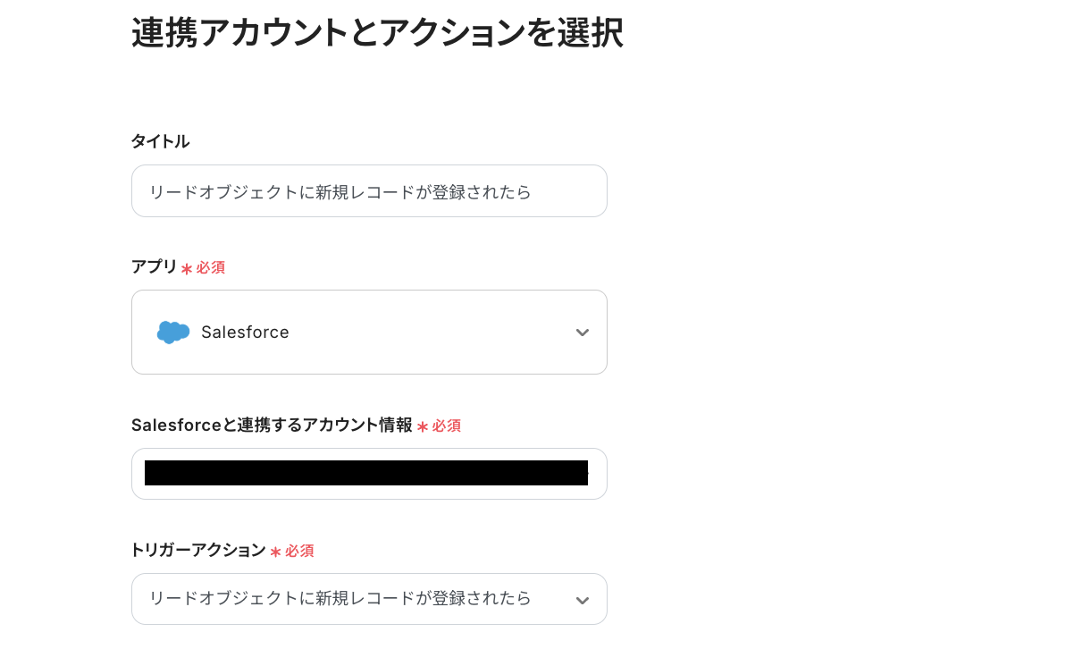 まずは、トリガーとなる「リードオブジェクトに新規レコードが登録されたら」をクリックして、連携するアカウント情報が入力されていることを確認してください。