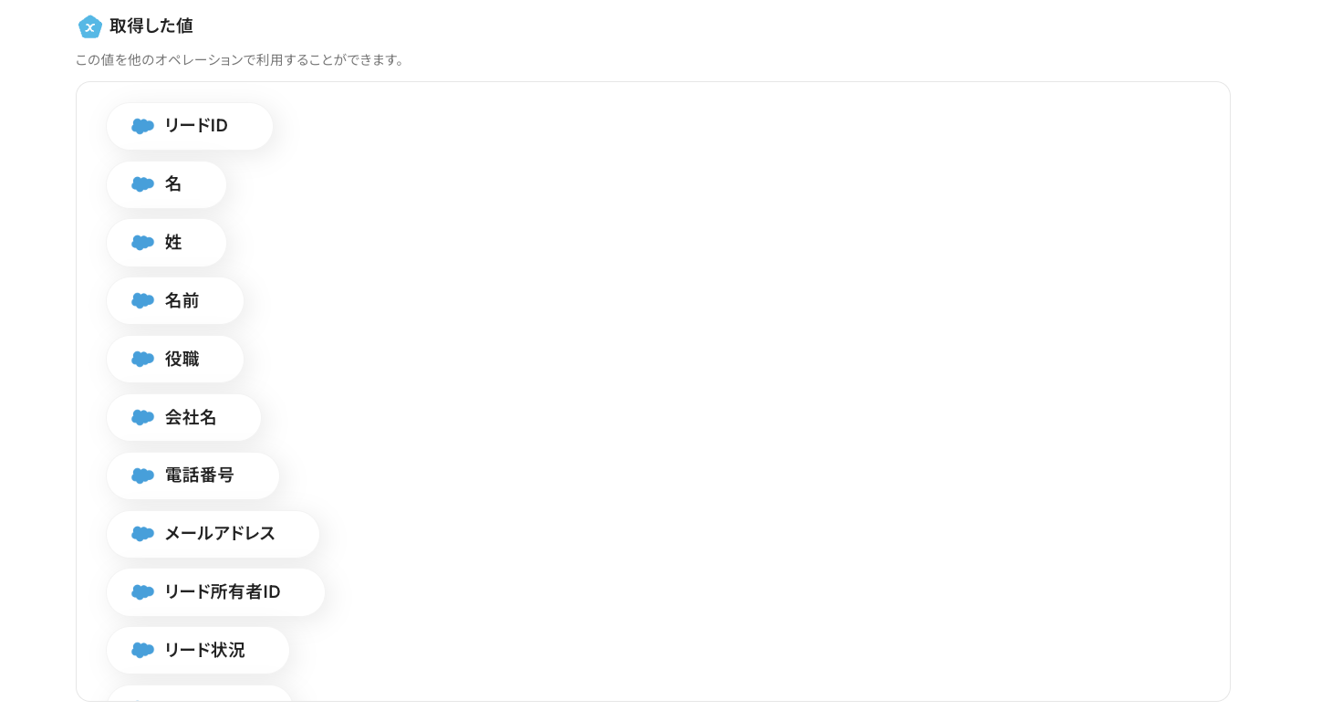 アウトプット情報は、「この値を他のオペレーションで利用することができます。」という注釈の通り、この後のステップで引用・活用できます。