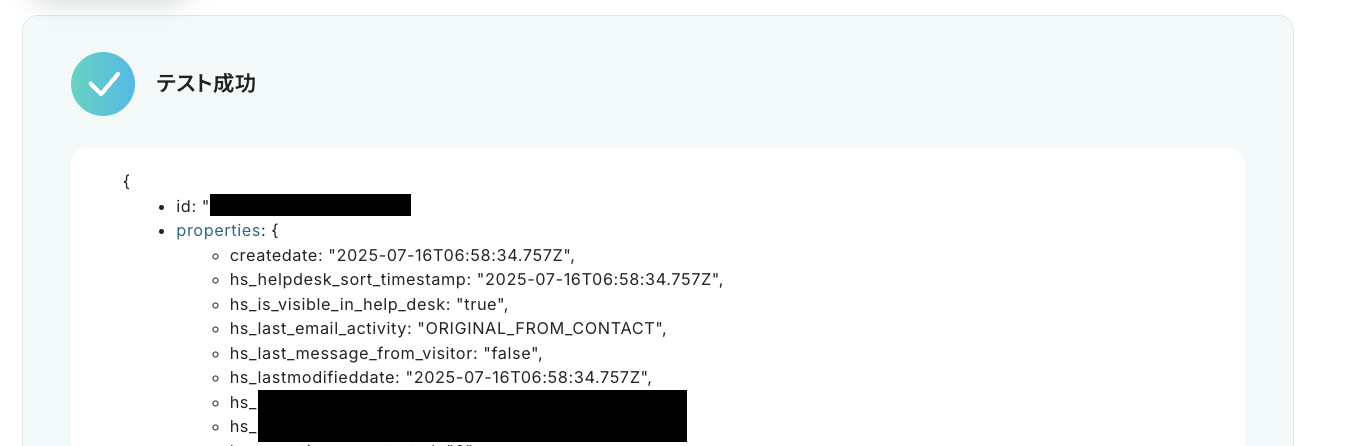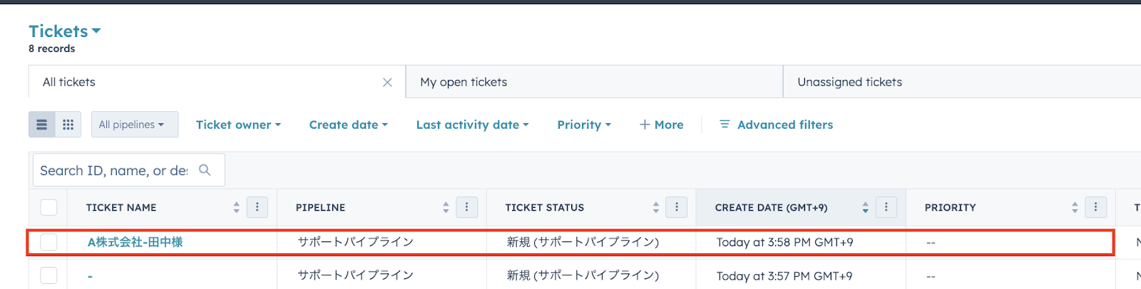 テストが成功すると、HubSpot内に以下のように自動でチケットが作成されました!