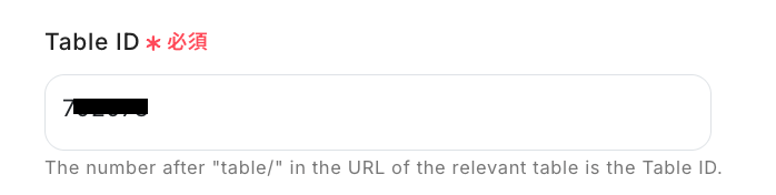 Table ID: 設定欄下に記載されている注釈に従い、フローで使用する該当のテーブルのURL内から値を取得しましょう。 「table/」の後の数字がテーブルIDとなるので、値を確認して設定してください。