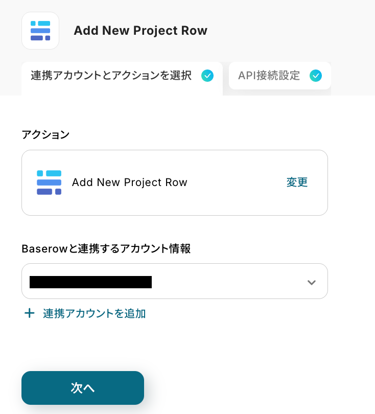 これまでのステップ同様に、連携するアカウントと実行アクションの設定内容を確認し、「次へ」を押しましょう。