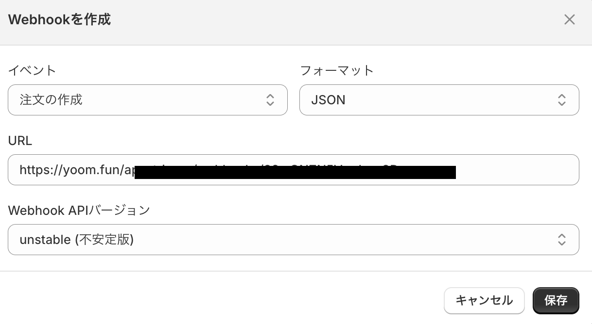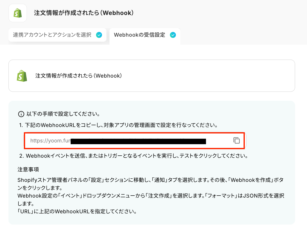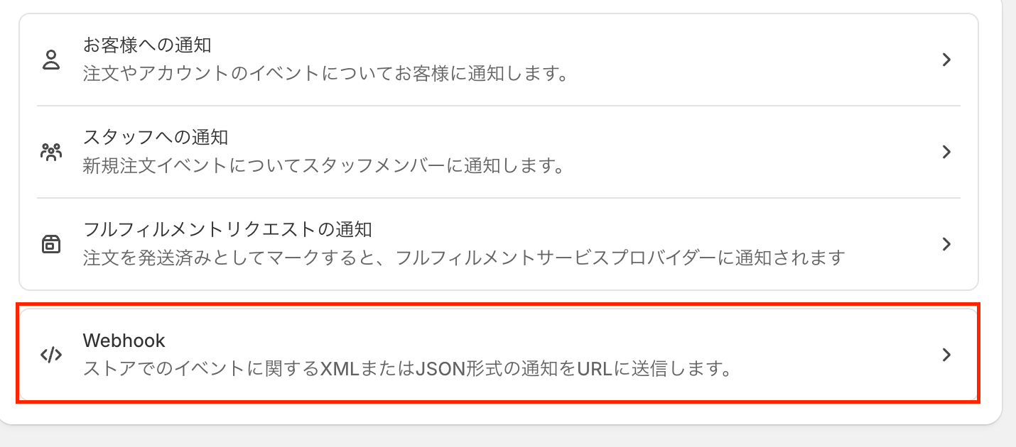 次に、Webhookの受信設定を行います。 この設定はShopifyの画面で行いますので、下図赤枠のURLをコピーしておき、Shopifyの画面に移動しましょう。