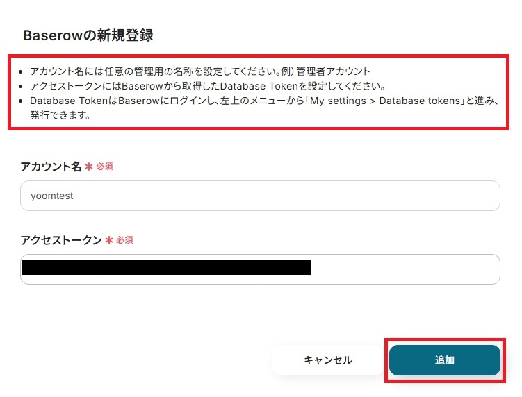下図赤枠内に記載されている手順に従い、アカウント名とアクセストークンを入力してください。 入力後、「追加」を押したらYoomとの連携は完了です!