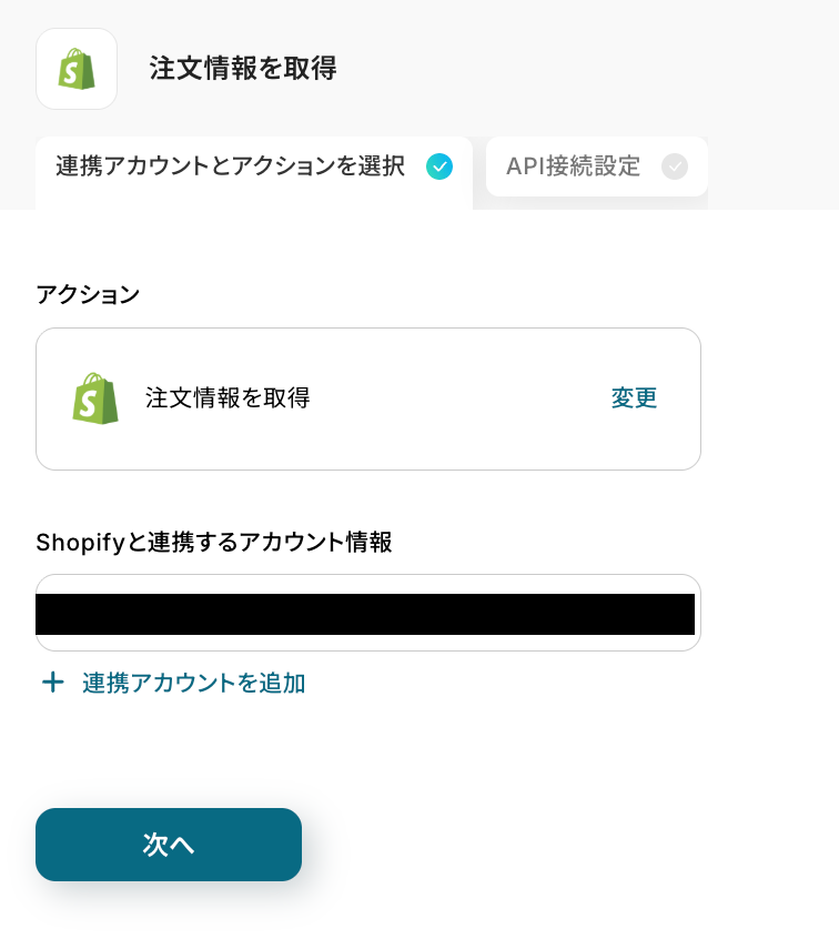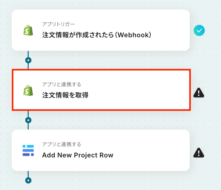 ステップ4:Shopifyの注文情報を取得する設定 続いて、トリガーで検知したShopifyの注文情報の詳細を取得する設定を行います。