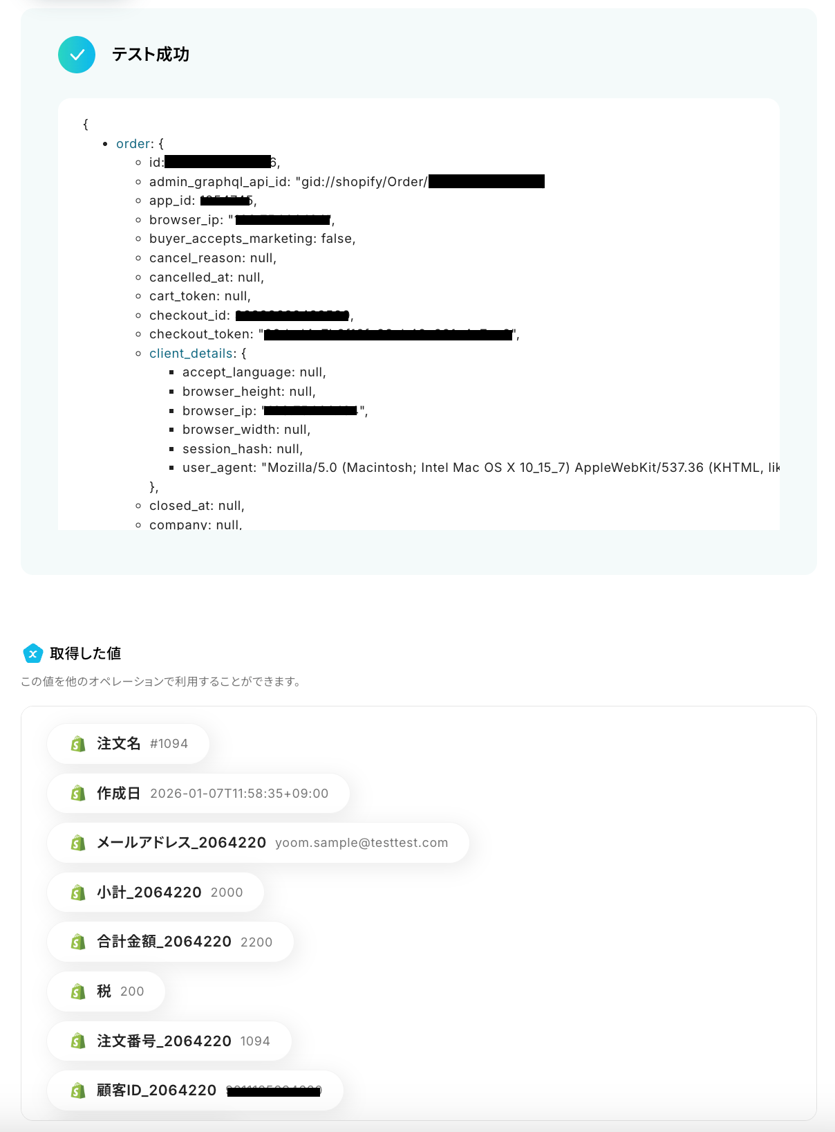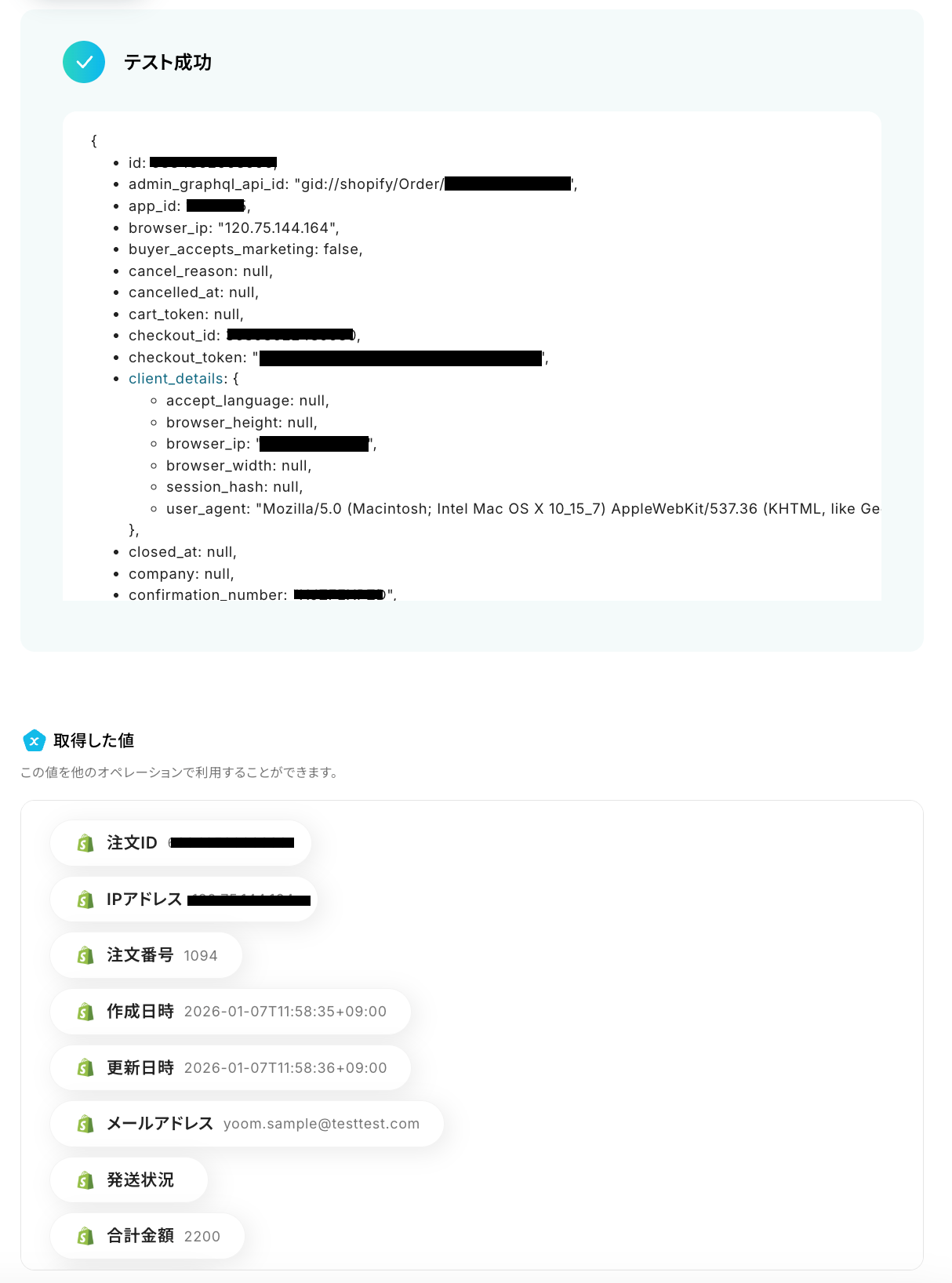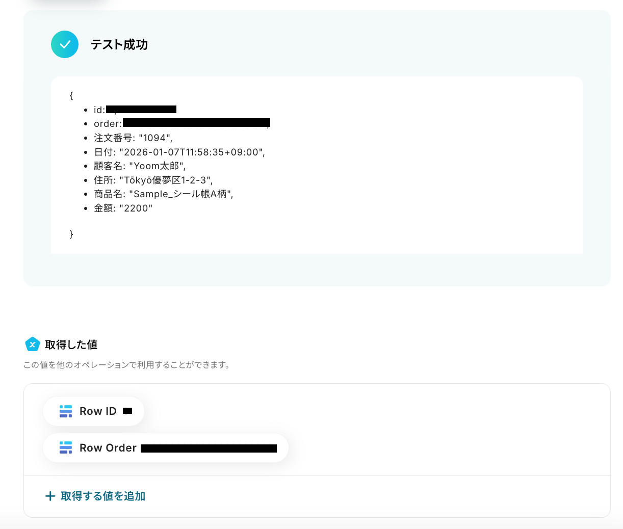 設定が完了したら「テスト」をクリックし、該当する注文の詳細情報が「取得した値」に抽出されることを確認してください。
