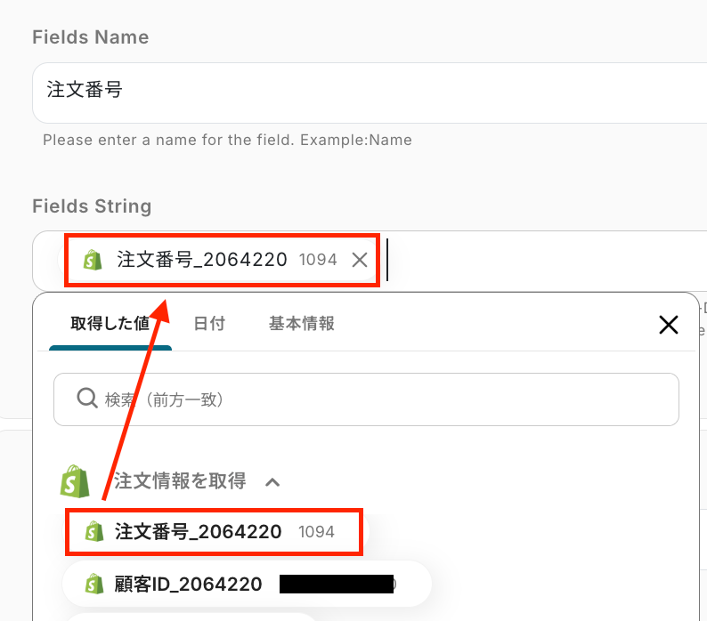 Fields String :テーブルに追加するデータを、「取得した値」を用いて適切な値をマッピングしていきます。 設定欄をクリックすると「取得した値」が表示されるので、該当する値を設定してくださいね! このように「取得した値」を使って設定することで、フローが起動する度に最新の注文データを自動で追加できるようになります。 なお、直接入力してしまうと”固定値”となり、毎回同じ値が繰り返し追加されてしまうため、ご注意ください。