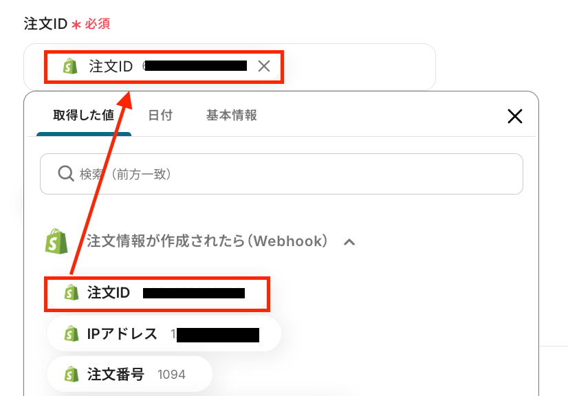 注文ID :下図のように「取得した値」を使って設定します。 このように「取得した値」を引用することで、フローが起動するたびに最新の注文情報の詳細を取得できるようになりますよ! なお、「取得した値」を使わずに直接値を入力した場合は”固定値”となり、毎回同じ注文情報を繰り返し取得することになるため、必ず「取得した値」を使って設定する ようにしましょう。