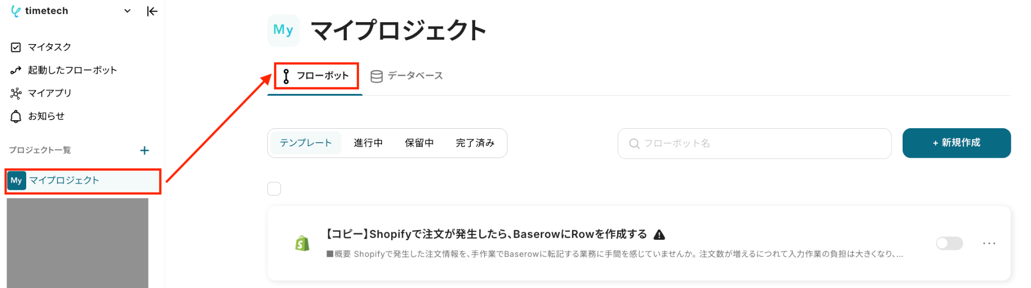 Yoomの画面左側にあるメニュー欄から「マイプロジェクト」にアクセスし、「フローボット」を選択すると、「【コピー】Shopifyで注文が発生したら、BaserowにRowを作成する」という名前で格納されているはずです。