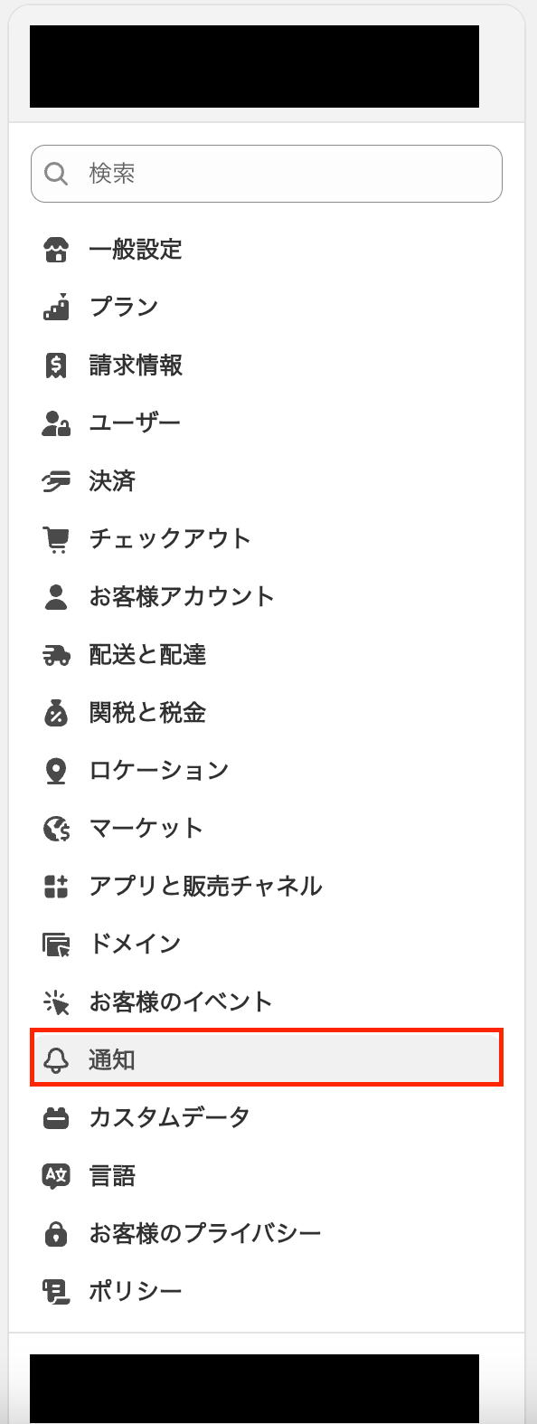 Shopifyに移動したら「設定」ページにアクセスし、「通知」を選択します。