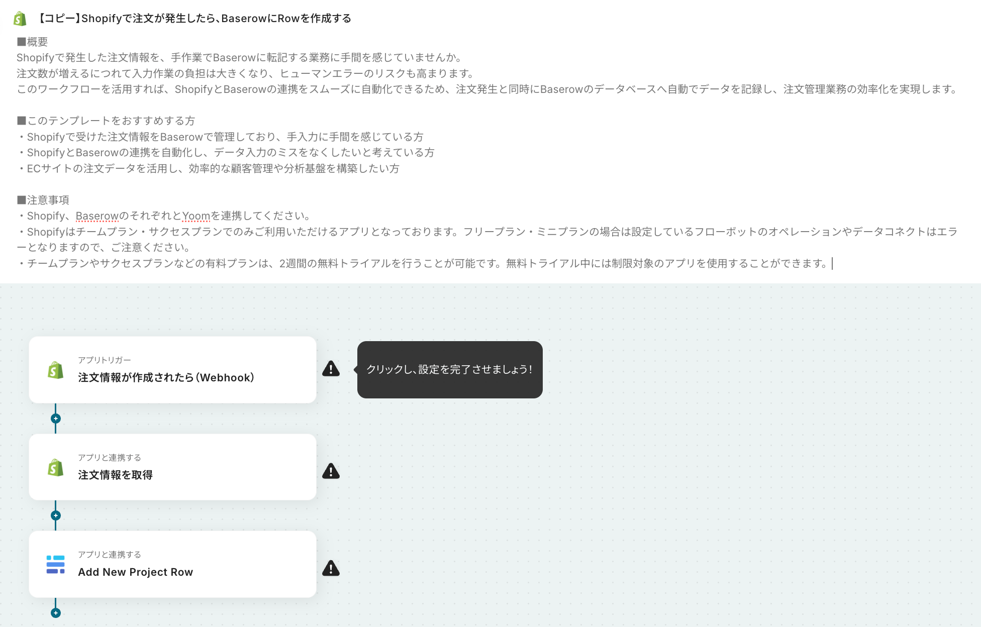 はじめに、ShopifyとBaserowをYoomと連携します 次に、トリガーでShopifyを選択し、「注文情報が作成されたら(Webhook)」というアクションを設定します 次に、オペレーションでShopifyを選択し、「注文情報を取得」というアクションを設定します 最後に、オペレーションでBaserowの「Add New Project Row」アクションを設定し、Shopifyのトリガーで取得した情報を引用して、指定のデータベースにRowを作成します ※「トリガー」:フロー起動のきっかけとなるアクション、「オペレーション」:トリガー起動後、フロー内で処理を行うアクション ■このワークフローのカスタムポイント