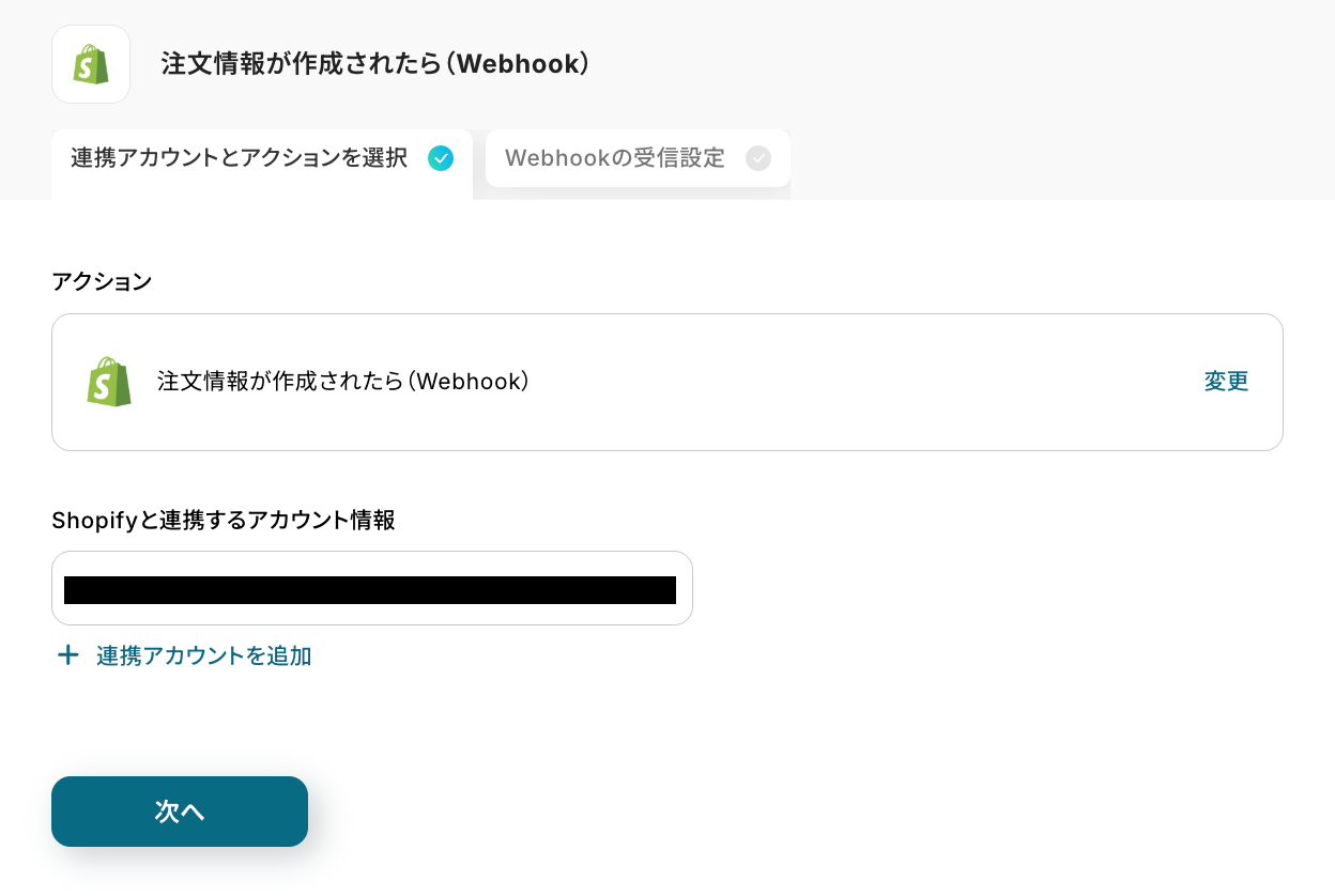 アクションは「注文情報が作成されたら(Webhook)」のままでOKです!